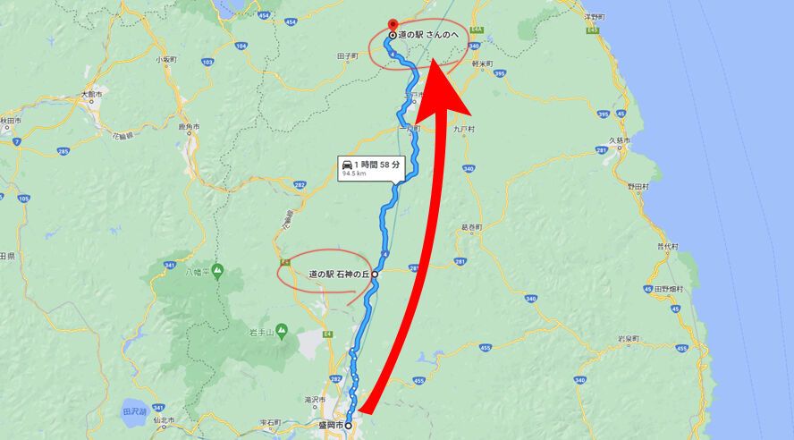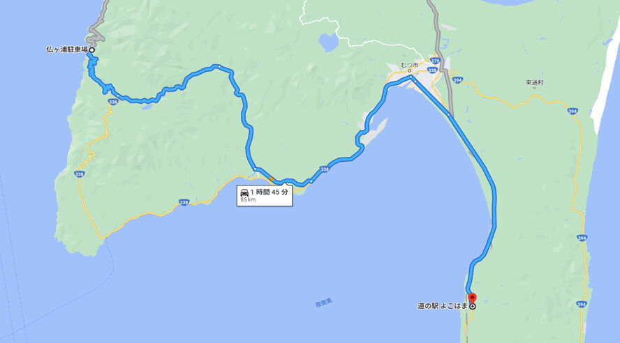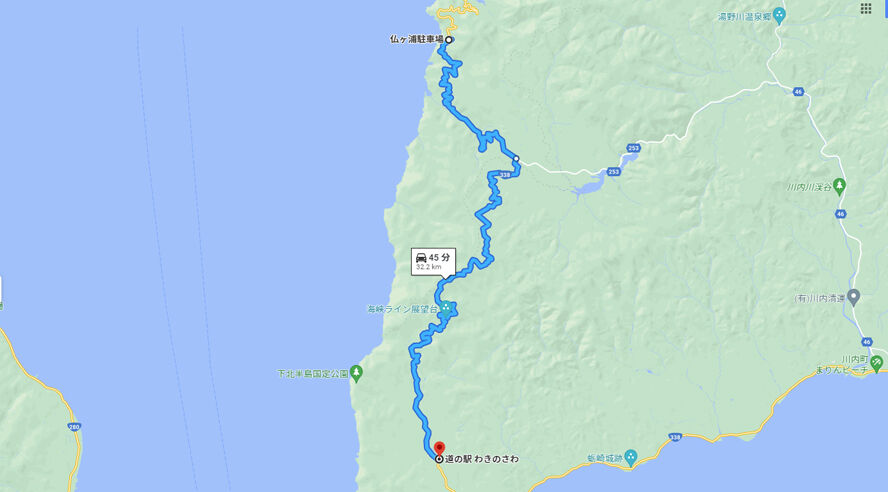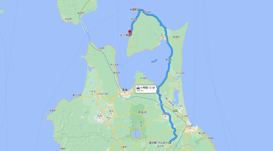 現在地の「三戸」から本州最北端「大間」を経由し「仏ヶ浦」までは200㎞を超えるロングドライブ。