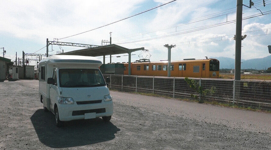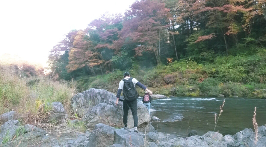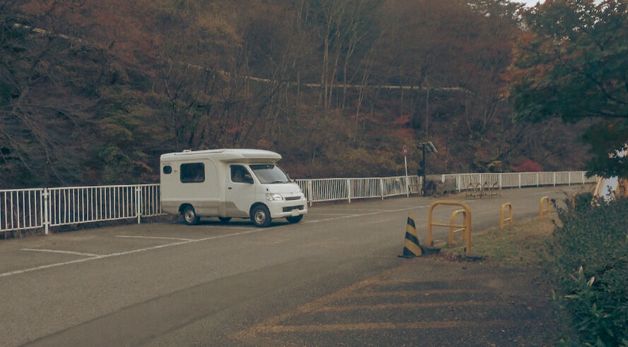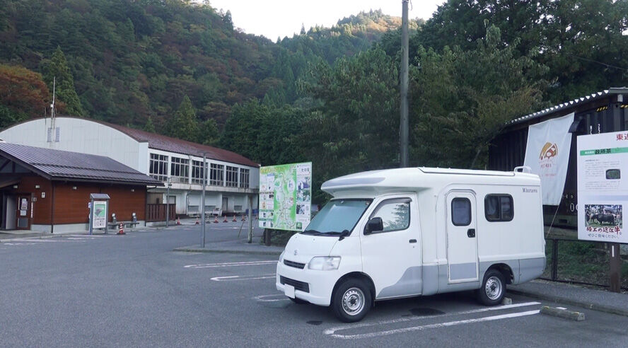 「桐の木平駐車場」にキャンピングカーを停めて川沿いを散策。